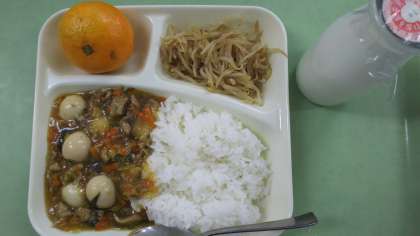 中華丼・牛乳・もやしの中華和え・みかんです。