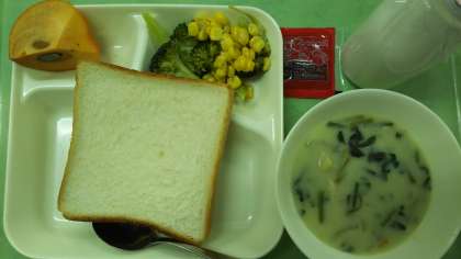 パン・牛乳・ホタテ貝のクリームシチュー・ブロッコリーとコーンのサラダ・柿です。