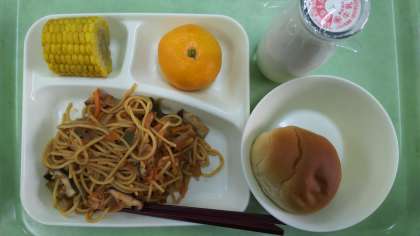 1/2パン・牛乳・きのこのスパゲッティ・焼きとうもろこし・みかんです。