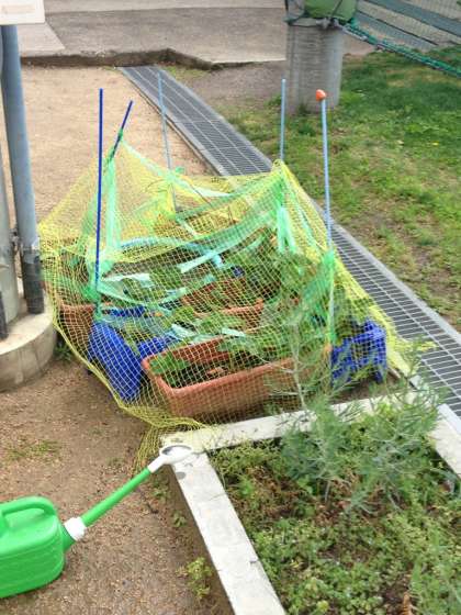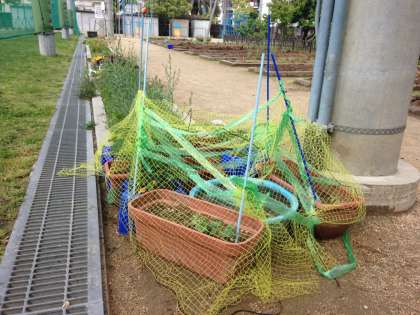 今、なかよしではお米・いんげんまめ・イチゴと栽培をしています。イチゴは、どんどんと実がなっています。お米といんげんまめは最近に植えたようです。カラスにつつかれないよう、網をしています。井高野産米が出来上がる、秋の収穫が楽しみです。