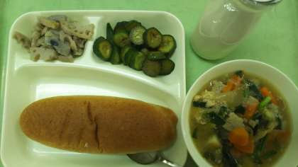 パン・牛乳・中華煮・れんこんのオイスターソース焼き・きゅうりの辛味漬けです。