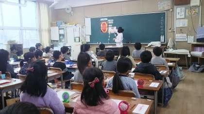 歯科衛生士さんに来ていただき、歯のしこうや、歯のみがき方についてお話してもらいました。