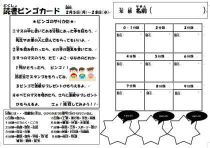 読書ビンゴは、今月いっぱいやっていますので、参加したい人は、図書室に紙を取りに来てくださいね。