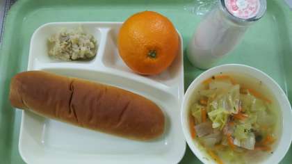 パン・牛乳・押し麦のグラタン・スープ・いよかんです。
