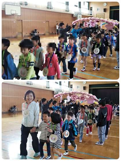 6年生手作りのメダルをかけてもらい、うれしそうな1年生。