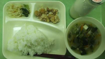 米飯・牛乳・鶏肉の唐揚げ・中華スープ・チンゲン菜ともやしの甘酢和えです。