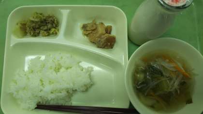 米飯・牛乳・鶏肉のオイスターソース焼き・中華スープ・ツナと野菜の胡麻炒めです。