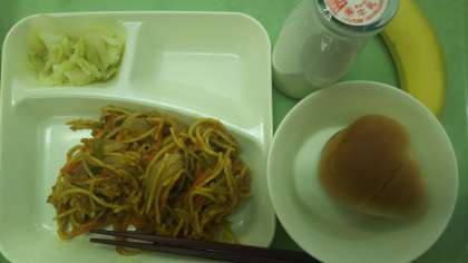 1/2パン・牛乳・カレースパゲッティ・キャベツのサラダ・バナナです。