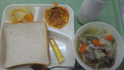 パン・はちみつ・牛乳・豚肉と野菜のスープ煮・変わりピザ・ミックスフルーツです。
