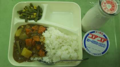 牛肉と大豆のカレーライス・牛乳・三度豆とコーンのサラダ・ヨーグルトです。