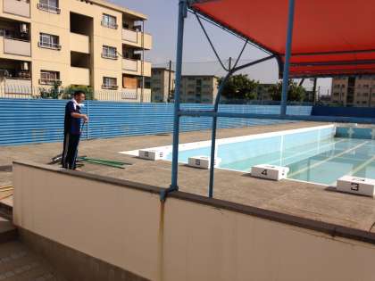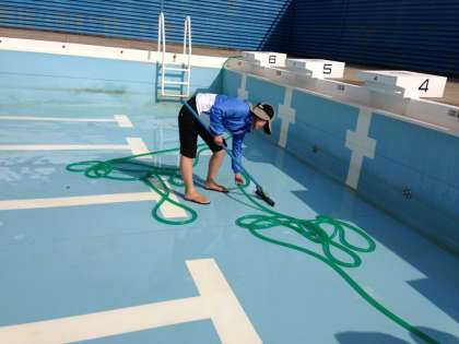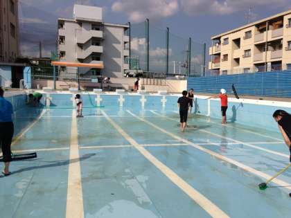 来週6月16日から子どもたちが楽しみにしているプールが始まります。今日から泳げるほど日差しが強い中、教職員全員でブラシなどを使って、汚れを落としました。プールは見る見るうちにきれいになっていきました。