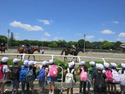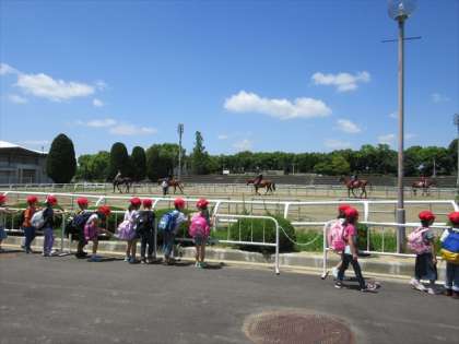 昼食の後、馬を見に行きました。目の前で馬の姿を見て、喜んでいました。