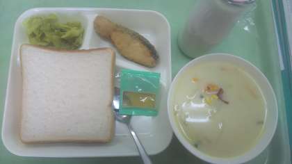 パン・りんごジャム・牛乳・サーモンフライ・豆乳コーンスープ・キャベツのカレーソテーです。