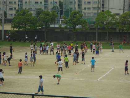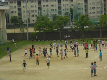 昼休みの運動場は、ドッジボールをする子どもたちの元気な声が響いています。