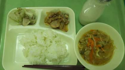 米飯・牛乳・鶏肉の甘辛焼き・みそ汁・キャベツの赤シソ和えです。