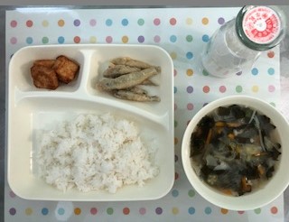 14日の献立は、いわしてんぷら・五目汁・あつあげのしょうがじょうゆかけ・ご飯・牛乳です。