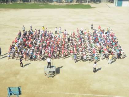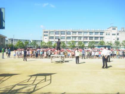 毎週月曜日は、全校児童が運動場に集まって、児童朝会が行われます。