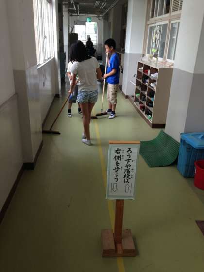 給食が終わると、掃除の時間になります。子どもたちは、みんなが使う廊下やトイレをいつも頑張ってきれいにしてくれています。