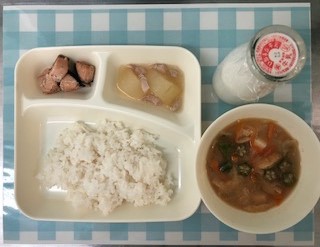 今日の献立は、さけのつけ焼き・みそ汁・とうがんの煮物・ご飯・牛乳です。