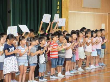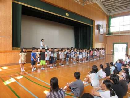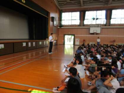 講堂で、全校児童が集まり、校長先生から1学期を終えてのお話を聞きました。