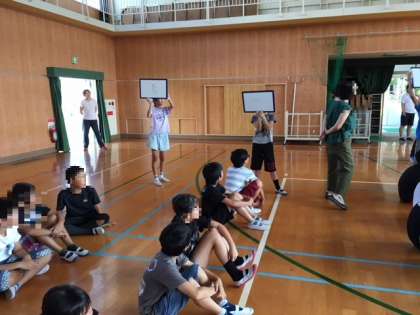 集会委員からの説明で、口の動きを見てことばを伝えるゲームをしました。