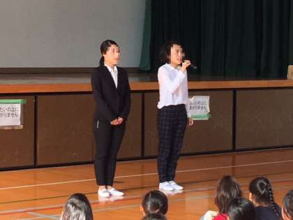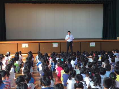 朝から、気温も高いので、講堂で全校集会を行いました。
