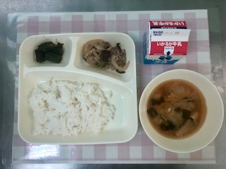 5日の給食は、豚肉の甘辛焼き・みそ汁・オクラのおかかいため・ごはん・牛乳です。