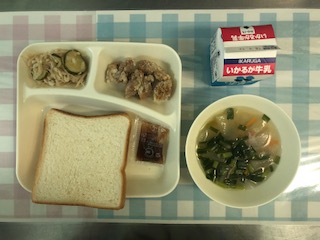 6日の給食は、鶏肉のからあげ・とうがんの中華スープ・切り干し大根の辛みづけ・食パン・牛乳・イチゴジャムです。