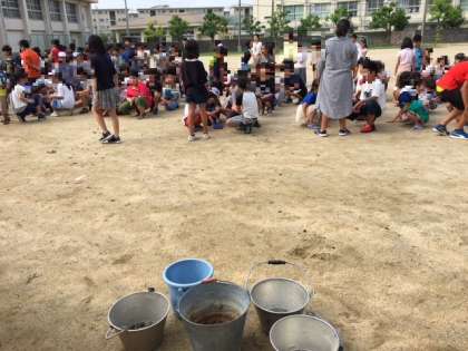 児童集会が校庭で行われました。集会委員の司会でゲームを行いました。そのあと、全員で、校庭の石やゴミ拾いをしました。危ないものが落ちてないように、みんなで気をつけて拾いました。