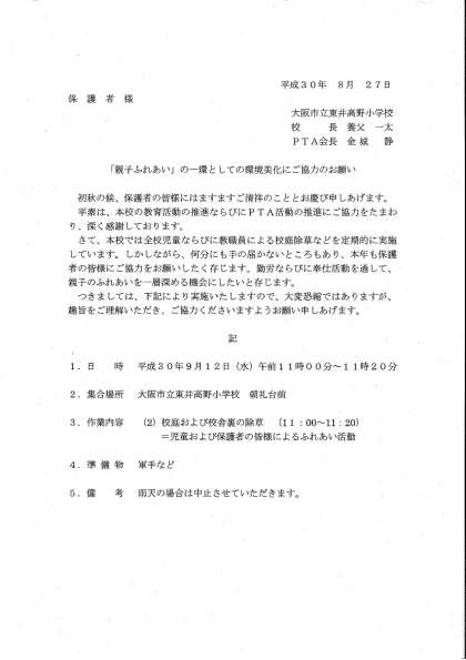 明日(9月12日)は、「親子ふれあい」の一環としての環境美化を、予定しています。