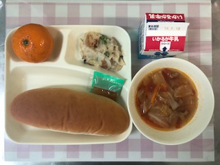 12日の給食は、豆乳マカロニグラタン【米粉】・トマトスープ・冷凍みかん・大型コッペパン・牛乳・リンゴジャムです。