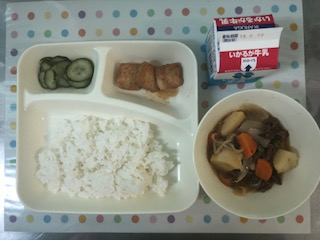 13日の給食は、肉じゃが・あつあげのみそだれかけ・あっさりきゅうり・ごはん・牛乳です。