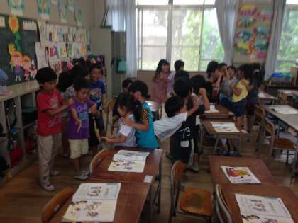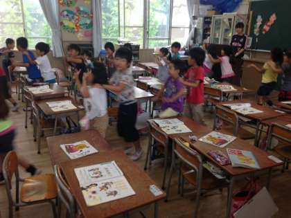 1年生の音楽の時間です。先生のオルガンに合わせて、リズムよく体を動かしジャンケンをしています。とても楽しそうに取り組んでいました。