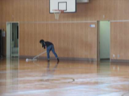 運動場では、側溝の清掃で、たまった土を取りました。雨が降っても、運動場の水はけがよくなると思います。体育館では、清掃の後、床にワックスをかけてくださいました。