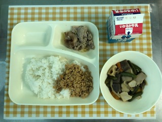 4日の給食は、豚肉のねぎじょうゆ焼き・ふきよせ煮・ツナ大豆そぼろ・ごはん・牛乳です。