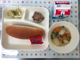 9日の給食は、鶏肉の香草焼き・スープ煮・サワーキャベツ・大型コッペパン・牛乳・イチゴジャムです。
