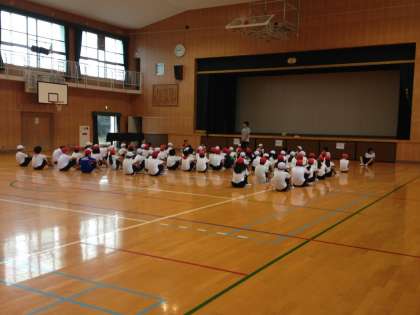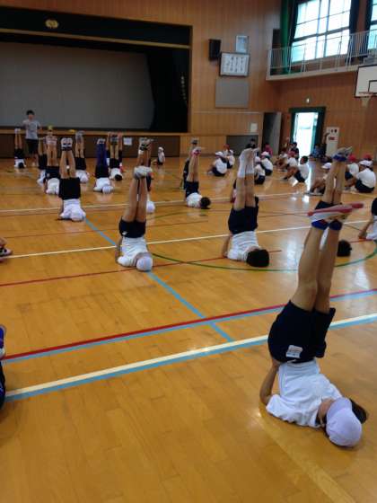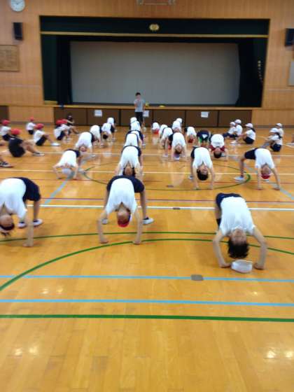 今日は、雨だったので水泳授業が体育館での授業に変わりました。まだ1学期ですが、10月の運動会の組体操に向けて練習をしていました。ブリッジ、Vの字などの個人でやる練習です。6年2組が見本となって、1組、3組が練習していました。蒸し暑い中、子どもたちみんなとても熱心に取り組んでいました。