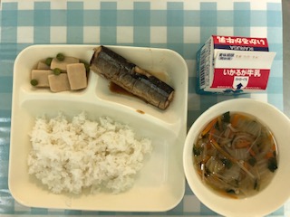 10日の給食は、さんまのさんしょう焼き・すまし汁・高野どうふの煮物・ごはん・牛乳です。