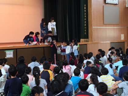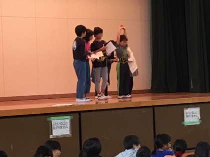 今日は朝から小雨が降っていたので、講堂で児童集会を行いました。
