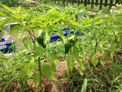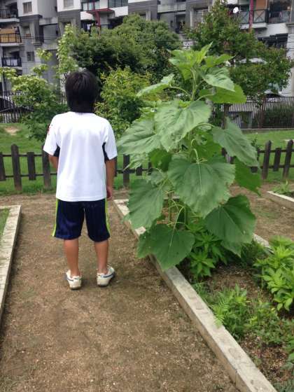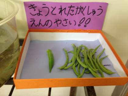 今の畑の様子です。なかよしの畑では、オクラを収穫し、2年生の畑はピーマンが実っています。また、ヒマワリも大きく成長しては葉っぱもとても大きく育っています。