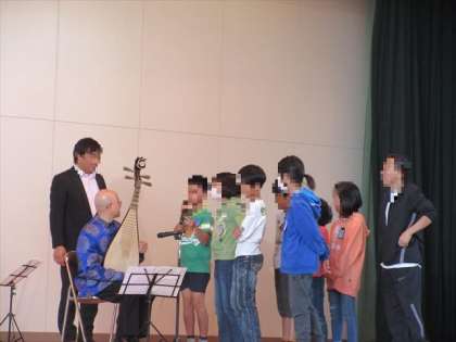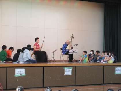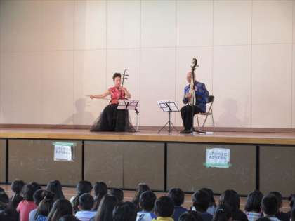 「チャイナクラッシック」による、中国の伝統的な楽器(びわ、胡弓)の演奏と、音楽に合わせた雑技の演技でした。質問コーナーでは、たくさんの子どもたが手を挙げて質問をしました。また、舞台に上がって、近くで楽器の演奏を聴くことができました。