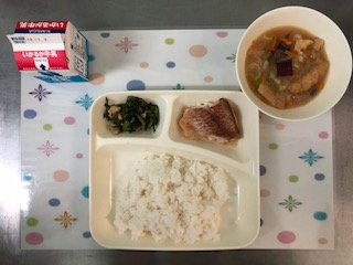 1日の給食は、赤魚のしょうゆだれかけ・さつまいものみそ汁・小松菜の炒め物・ごはん・牛乳です。