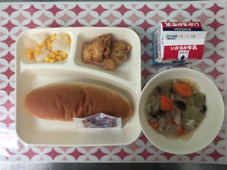 5日の給食は、白身魚のフリッター・スープ煮・だいこんのピクルス・大型コッペパン・牛乳・いちごジャムです。