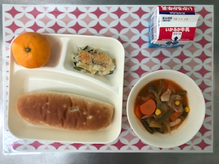 7日の給食は、鶏肉と野菜のケチャップ煮・ほうれん草のグラタン・みかん・おさつパン・牛乳です。