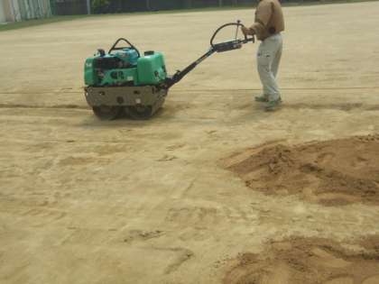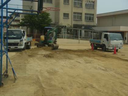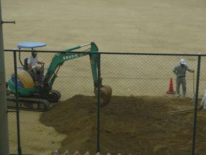 石やコンクリート片が運動場の所々で、表面にまで顔を出しており、その撤去のために運動場を掘り起し、新たに土を入れる工事です。