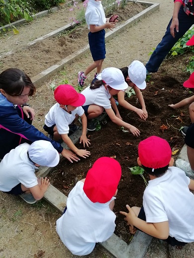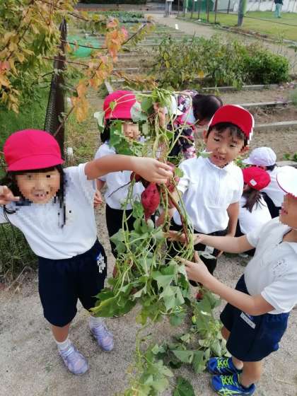 1年生では、学校の学習園で栽培していたおいもをみんなで掘りました。