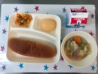 13日の給食は、豚肉と野菜のスープ煮・変わりピザ・白桃(缶)・黒糖パン・牛乳です。