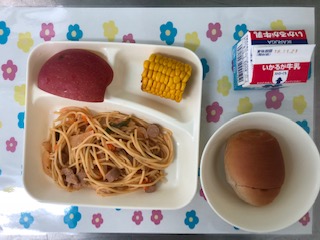 15日の給食は、チキントマトスパゲッティ・焼きとうもろこし・りんご・黒糖1/2クレセントパン、牛乳です。