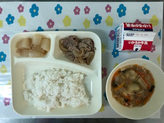 5日の給食は、豚肉のしょうが焼き・みそ汁・だいこんの煮もの・ごはん・牛乳です。