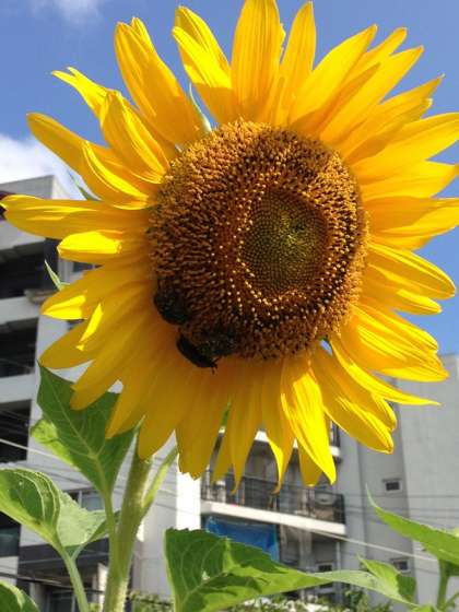 今日、畑でとても珍しい光景がありました。ひまわりの花の蜜をカナブンが吸っていたので写真に撮りました。
